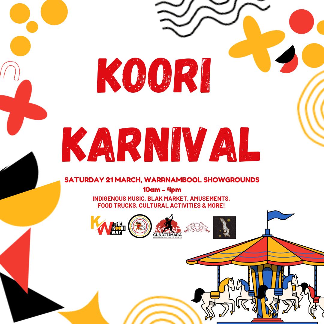 Warrnambool Showgrounds, Warrnambool VIC 3280The Koori Karnival is a FREE family fun day created by Mob for Mob. Dhauwurd Wurrung Elderly & Community Health Service (DWECH), Gunditjmara Aboriginal Cooperative, Kirrae Health Service Inc. and Winda-Mara Aboriginal Corporation are pleased to bring back the Koori Karnival for the second year running, that will feature amusements, live music, Blak Markets, food, cultural activities and much more!